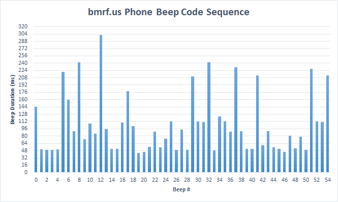 I have tried to measure the durations of each beep in the beep code sequence from the bmrf.us phone message. Measuring the length of each beep accurately by hand is painstaking work, and in many cases the edges of the beeps aren’t clearly defined due to some noise blips in the audio. I plotted the results in this chart: