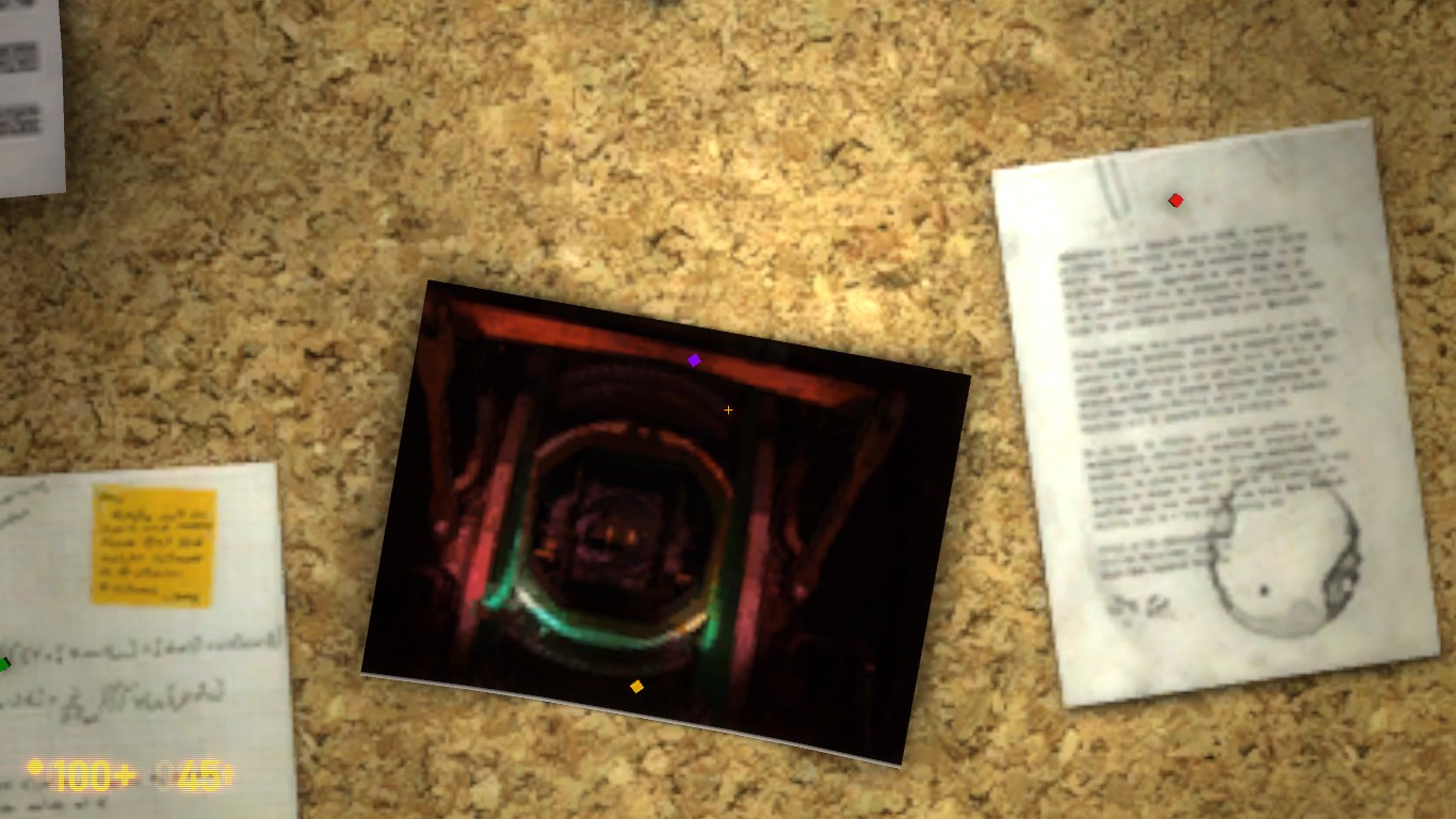 Anyone know what this is? It’s attached to a very common generic corkboard, but afaik unique. Appears in Questionable Ethics in the tunnel at the very end before the start of Surface Tension (where you must assault the machine gun emplacement). I’d love to get some other peoples uncolored impressions of it, so I’ll spoiler mine. It looks like an in-game screenshot to me, looking through a mechanical hatchway into a very large enclosed space, with the flashlight on. That description plus the color scheme makes me think it might be a sneak-peak Xen shot? From the ‘Grunt factory’ area, perhaps?