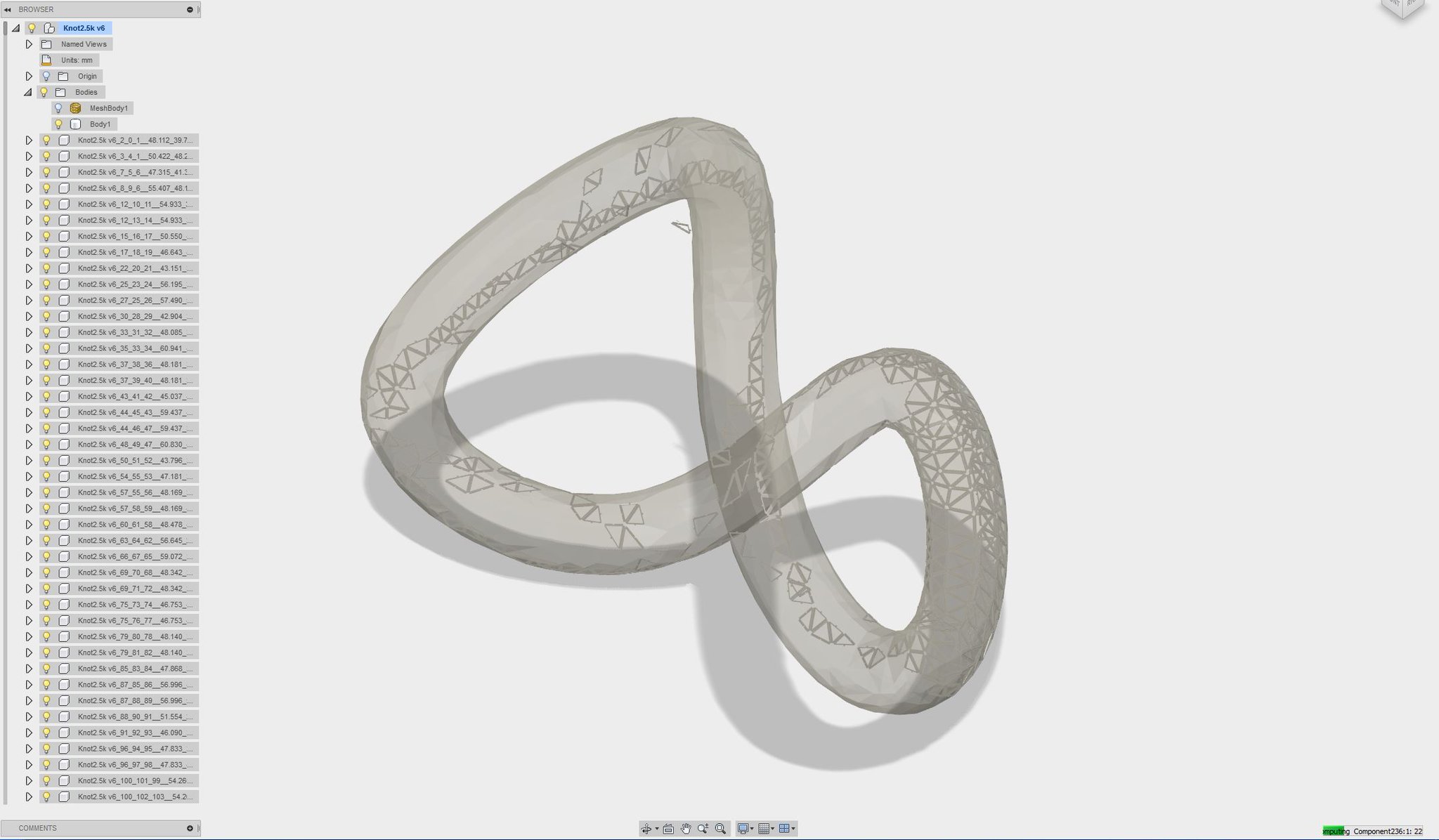 Running it on a new input object, here it is with about 600 out of 2,500 triangles completed. There’s a problem with the program whose API I’m using that causes the script to run in N^2 time when it should be running in linear time so idk if this will even finish in the next week or so. It gets slower and slower with each triangle completed.