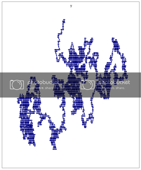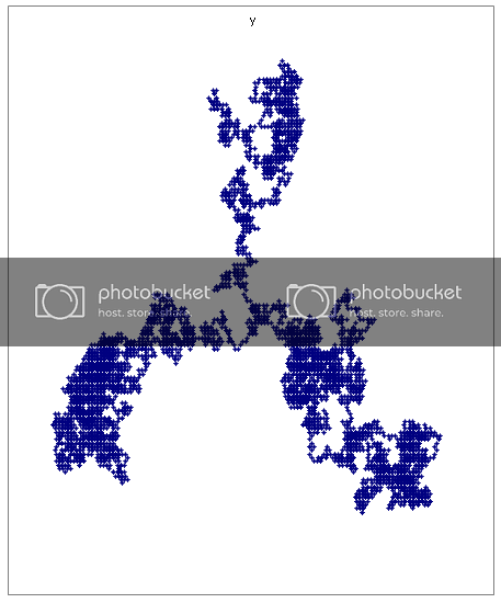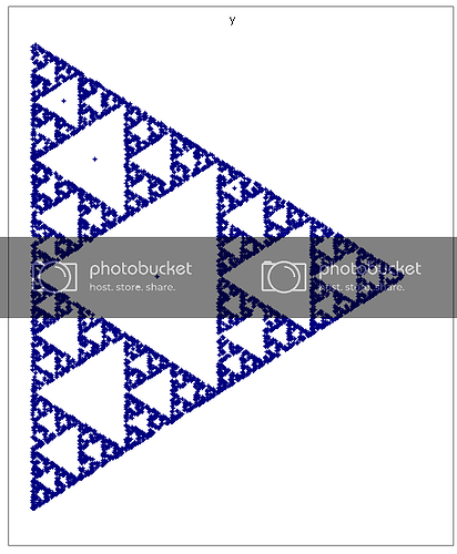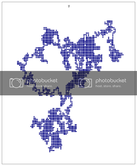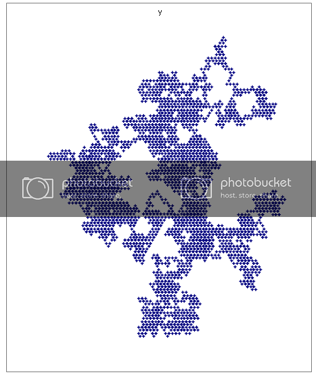 The reason the Sierpinski gasket stays (nearly indistinguishably) the same every time the program is run is because there are less possibilities with the graphing then when I input different numbers. All four graphs above were created by the same input, but every time the program ran, as you can see, the outcome was drastically different. I can explain this better and in more depth, if any of you are interested, when I make some more headway on the program. Eventually the goal is to release it so anybody can try; I think it’ll be interesting to see what everyone comes up with.