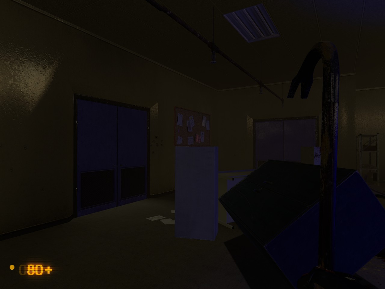 1.these doors in the zombie room are oddly blue as well as the ceiling light and props.