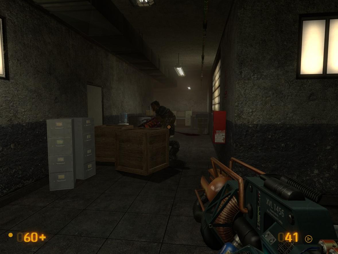 In directly accessing level H through the console, the game would repeatedly crash at the point where the wall to the Tank yard was about to explode, with the “HL2.exe not responding” error. I decided to directly load level G and proceeded to noclip into the room next to the security office with the zombie. I opened the door and blew the zombie up and I ended up with two dead zombies for the price of one! https://i.imgur.com/F05Xkj3.jpg. Proceeded down the hallway to the exploding wall and the “HL2.exe not responding” happened again.