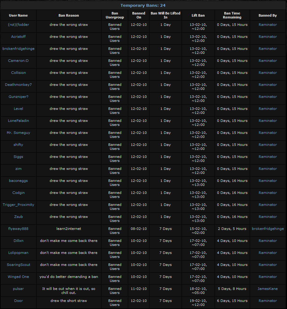 Lol at brokenfridgehinge being banned too. I guess no one is safe from Raminator.